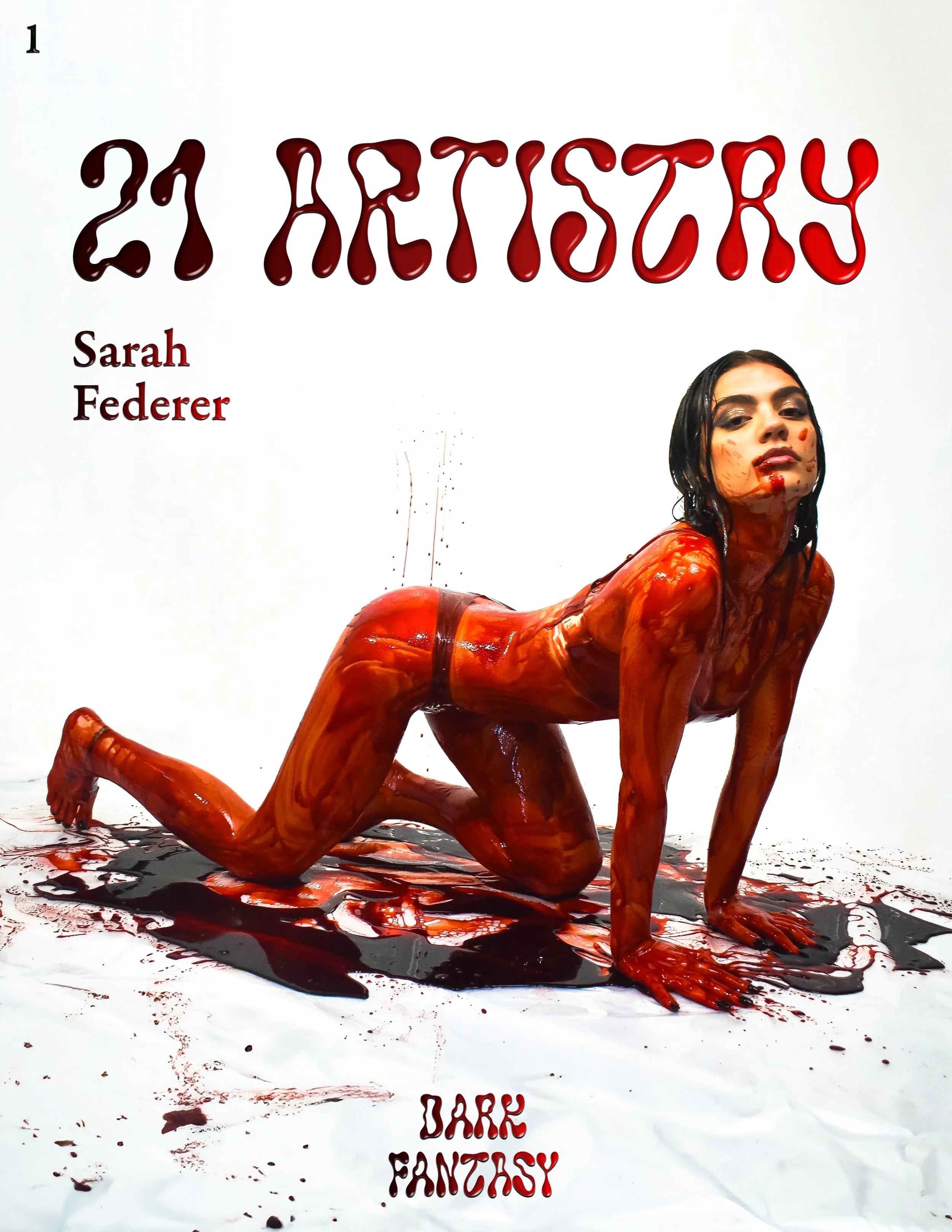 The cover look for this issue is shot in my home studio. Two gallons of special effects blood and fifty feet of plastic sheeting are in play. At Federer’s request, Hall and Oates’ “Maneater” blares on loop. “When the blood first touched my skin, it felt really cold,” Federer says. “But I embraced it and started posing with minimal direction from you. Something that I love about the way you work is you allow your models the freedom to move as they please. You see modeling as an art form and the model as a living canvas. That approach allows for something more real.”