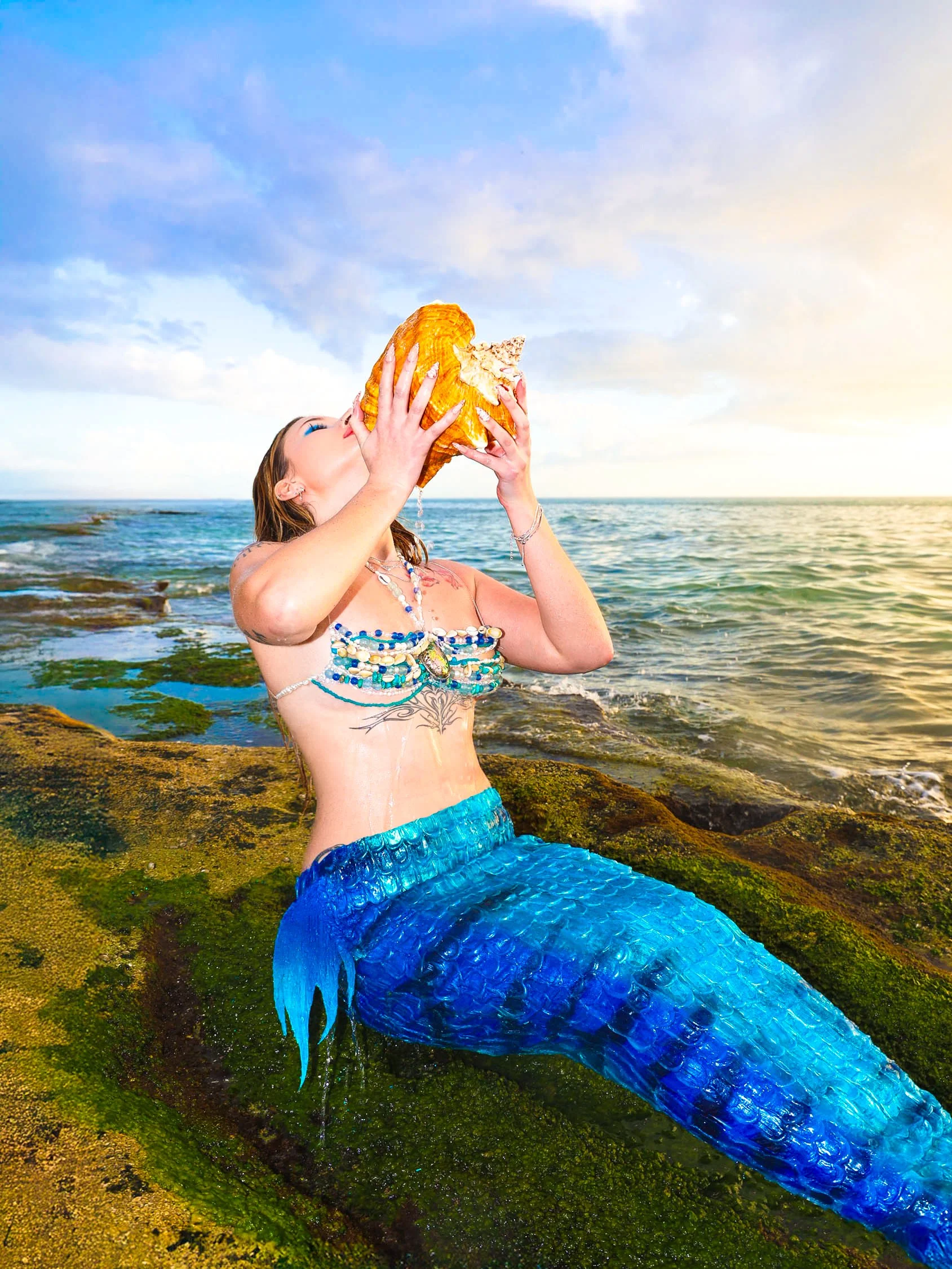 The first step in getting prepared to shoot is helping Ernst into the thirty-pound mermaid tail, which is not as smooth of a process as you might imagine. Lying at the edge of a rock in the middle of the ocean, the sun reflecting sparkles on the surface of the water, she shimmies her legs into the elastic fabric tail, then her feet into the skin-tight monofin fluke. “I hadn’t tried on the tail until we got to the location,” she shares. “We knew it was sized to my body and that it would fit. I had tried on the tail, but I hadn’t tried on the tail with the actual tail attachment, and that was what was so heavy. We had to trim the waist a little bit. We were in the middle of the ocean, and you had to swim to shore to get scissors. When you were traveling back and forth and you left me there, this bird came right up to me. Either it means mermaids are real or he thought I was a fish, because he was two inches from me. I could reach out and touch that bird. It was a snowy egret. You are having to haul ass back and forth in the water to get ready for the shoot. I have my tits out, facing the ocean—very liberating. The waves are crashing, and it’s starting to get wet. I’m trying to move around, and I’m paralyzed. You have to pick me up and move me to different spots as we do the shoot. I was worried about getting washed away. There was no mobility in that tail. The reason it wasn’t swimmable is because of the amount of detail work we put into it.”